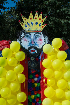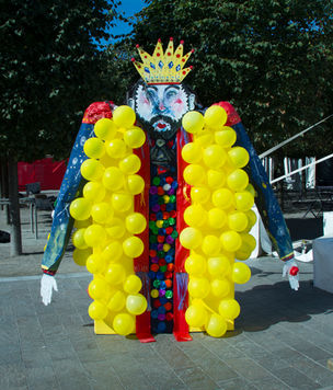 The "Mad King" and the "Eye that watches it all" are both the supreme force that controls everything. The King is an earthly symbol, while the Eye represents the mystical. To overcome the king is to withdraw his power by taking your chances. To master the Eye takes much more effort and strength because is not a frail human being; it is an idea based on faith. Both forces of power tell us how we should live and operate and what we can or can´t do. They are the frame and the margin that settles the concession (Usually imposed), to be able to work as a society and have a common ground. Often that duality of right and wrong is unable to be just to all. There is always a margin of relativity to the concepts. If there were no Eye or no King, what kind of system would we need to have that would be just for all? The piñata must be broken. The king can only be defeated by taking his wealth. A golden coin is hidden inside one of the balloons. Whoever finds the coin will get a crown and become the new king.